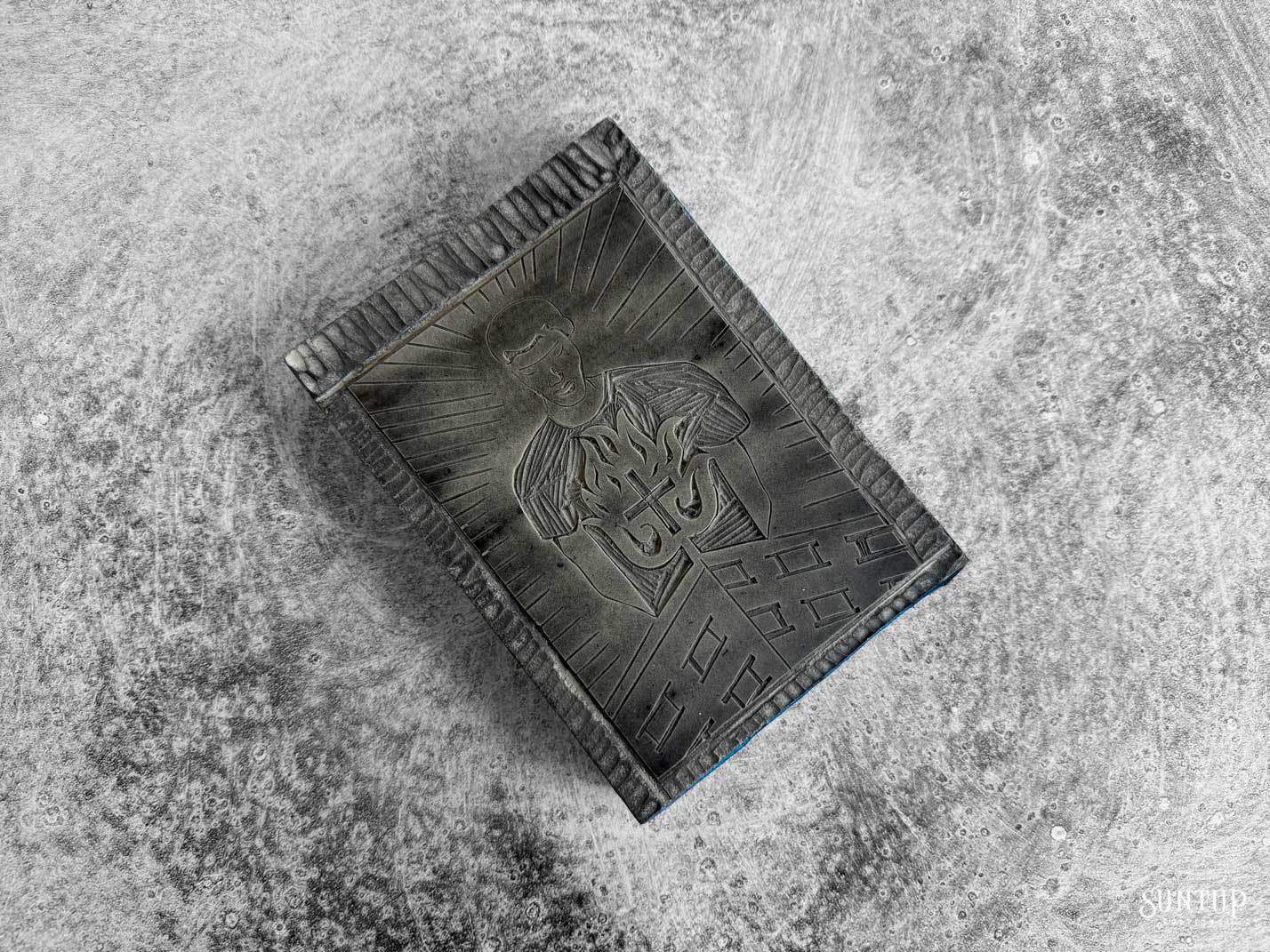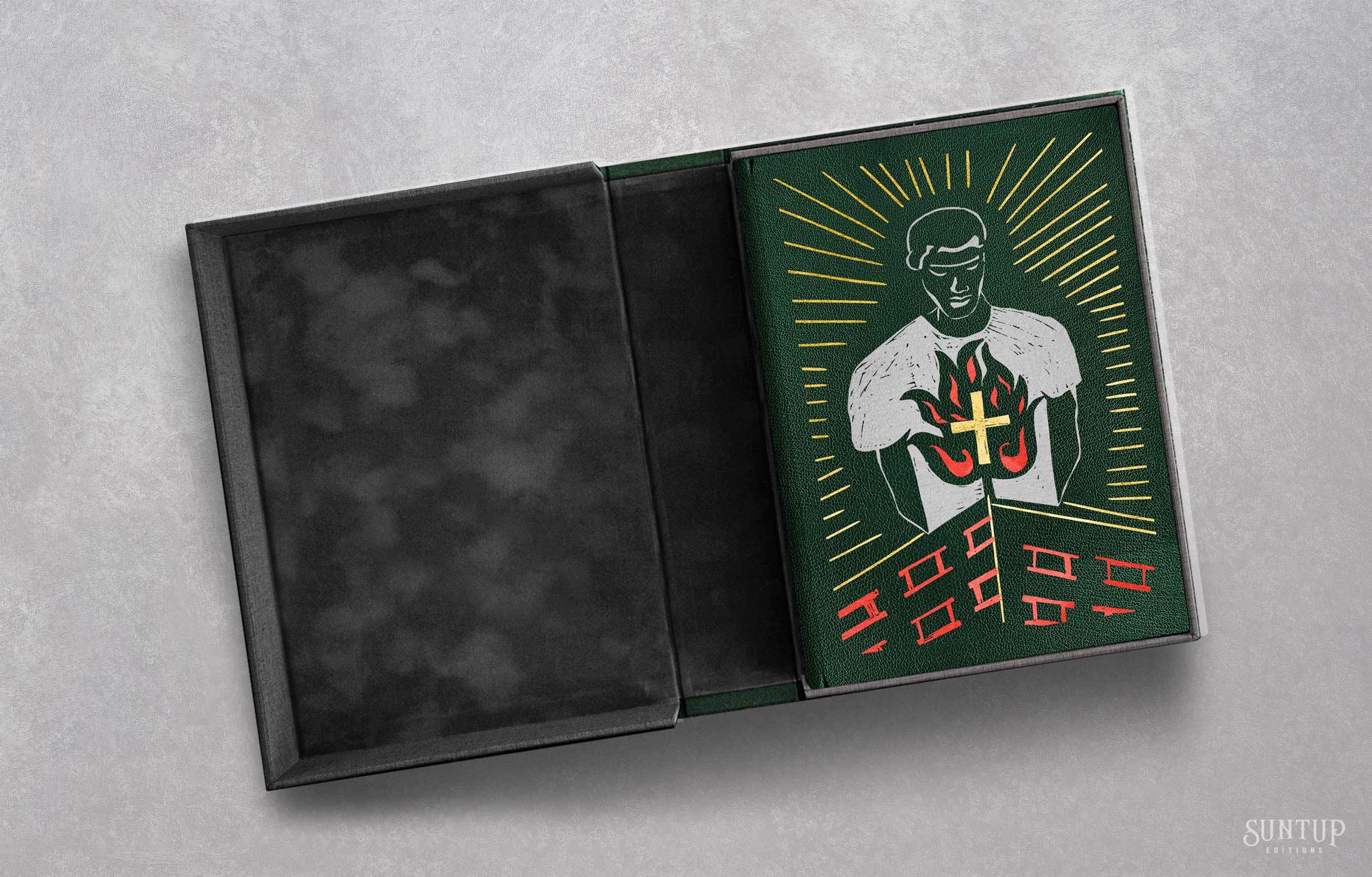The Lettered edition is limited to 26 copies and is a full goatskin binding which features a striking foil-blocked portrait of Bigger Thomas on the front cover, adapted from one of the original linocuts commissioned for this edition. Rendered in three colors, the image introduces an instance of color in an otherwise monochrome design. While the interior linocuts are printed in stark black ink, reinforcing the bleakness and moral gravity of the narrative, the cover offers a moment of heightened visual presence.