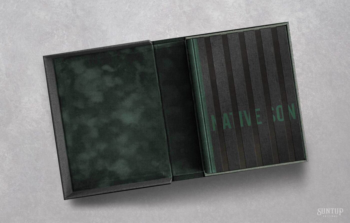 Vertical onlays of black full-grain fine split goatskin are affixed to the front cover. The title, bold but partially hidden, suggests a voice attempting to break through constraint—present, yet obstructed. This interplay of text and barrier speaks to Bigger Thomas’s experience: a life defined not solely by his actions, but by the boundaries imposed upon him by race, class, and fear. The design resists illustration in favor of metaphor, echoing the novel’s emotional and social weight through form and material.