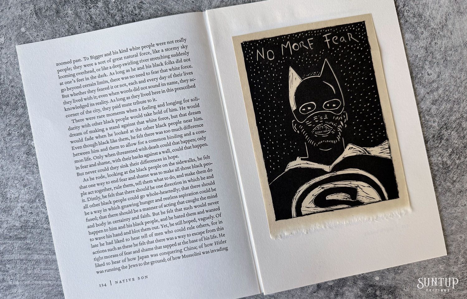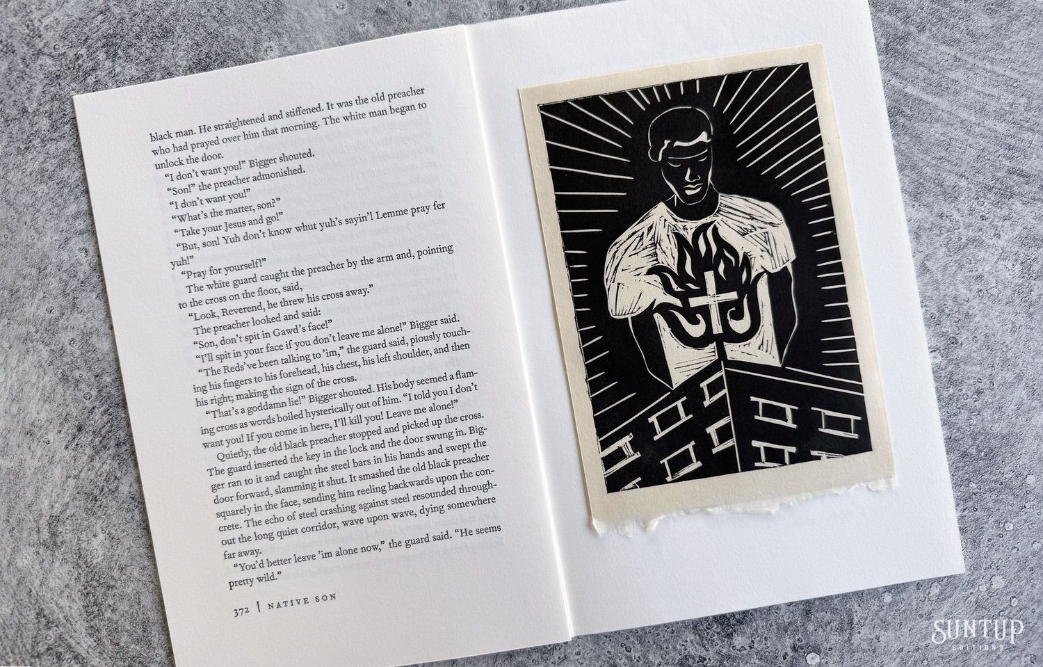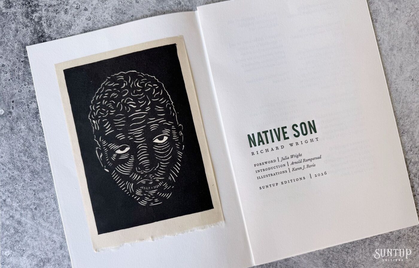 Our edition of Native Son by Richard Wright is presented in two states. The edition measures 6” x 9” and features eight linocuts by Karen J. Revis, a foreword by Julia Wright and an introduction by Arnold Rampersad. The linocut illustrations are printed from the blocks on Kitakata handmade paper and are tipped on. Designed by award-winning designer Jason Dewinetz. The text pages are set in Monotype Fournier with Alternate Gothic for display, and are printed letterpress by Scott Vile at The Ascensius Press in Buxton, Maine on Mohawk Via Vellum.