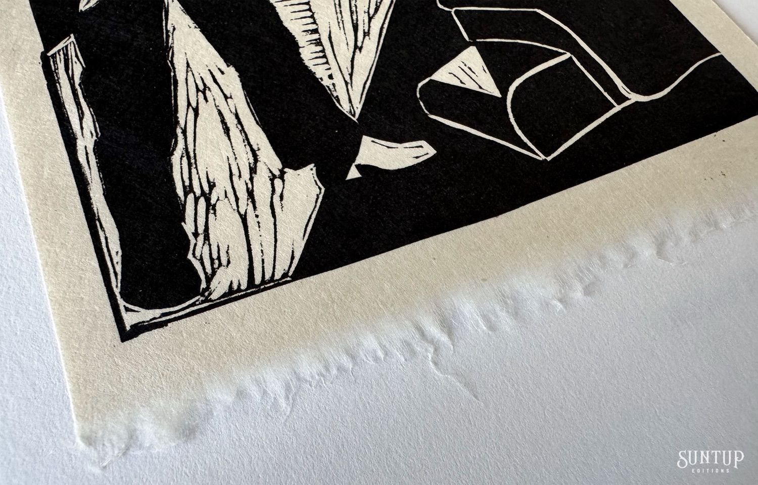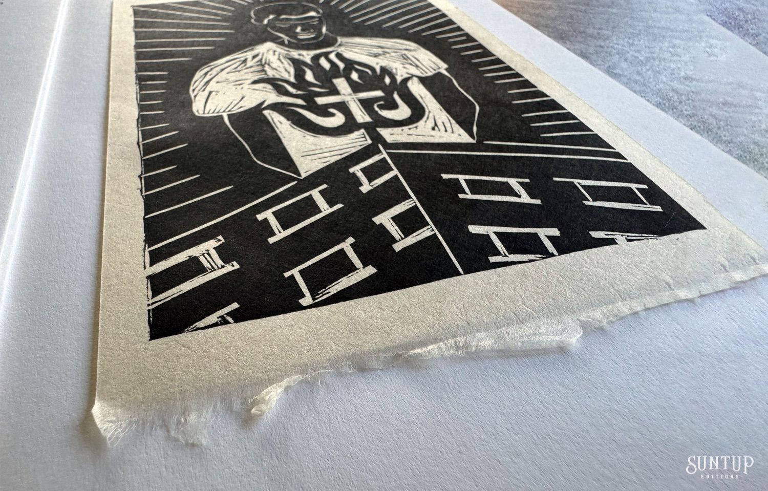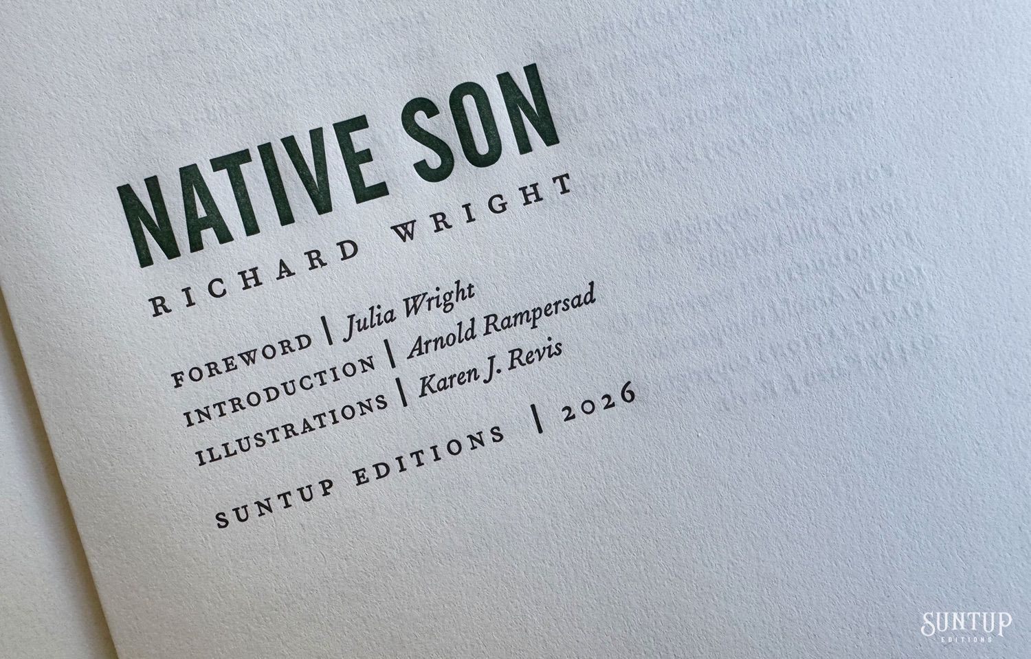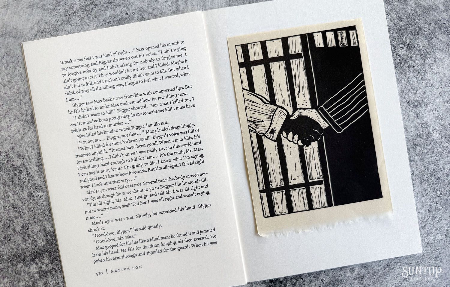 Our edition of Native Son by Richard Wright is presented in two states. The edition measures 6” x 9” and features eight linocuts by Karen J. Revis, a foreword by Julia Wright and an introduction by Arnold Rampersad. The linocut illustrations are printed from the blocks on Kitakata handmade paper and are tipped on. Designed by award-winning designer Jason Dewinetz. The text pages are set in Monotype Fournier with Alternate Gothic for display, and are printed letterpress by Scott Vile at The Ascensius Press in Buxton, Maine on Mohawk Via Vellum.