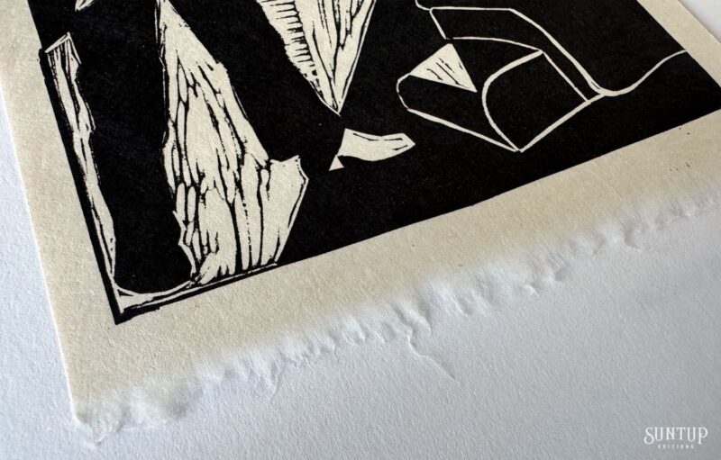 Endsheets are Hahnemühle Bugra and the cloth endbands are handmade. The edition is housed in a cloth covered clamshell enclosure with velour lined trays. It is printed letterpress on Mohawk Via Vellum with all illustrations printed from the original linocut blocks on Kitakata handmade paper. The edition is signed by Julia Wright, Arnold Rampersad and Karen J. Revis.