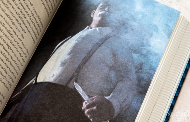 Quarter goatskin binding with a custom pattern design printed on cloth covering the boards and a foil blocked leather label. Endsheets are Hahnemühle Bugra and the head & tail bands are handmade with leather. The book is housed in a cloth covered clamshell enclosure with velour lined floors and a foil blocked leather spine label. The text pages are set in Warbler and William Engraved and are printed letterpress on Superfine.