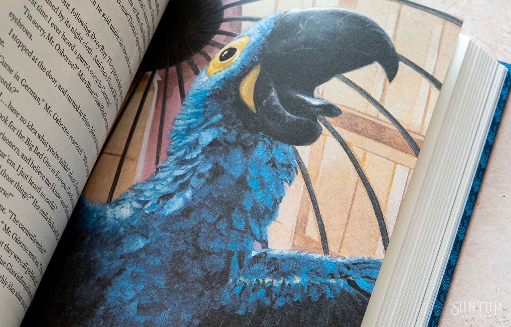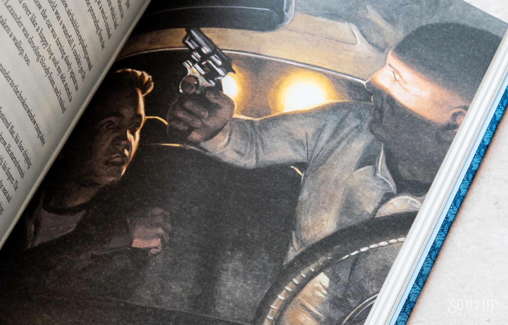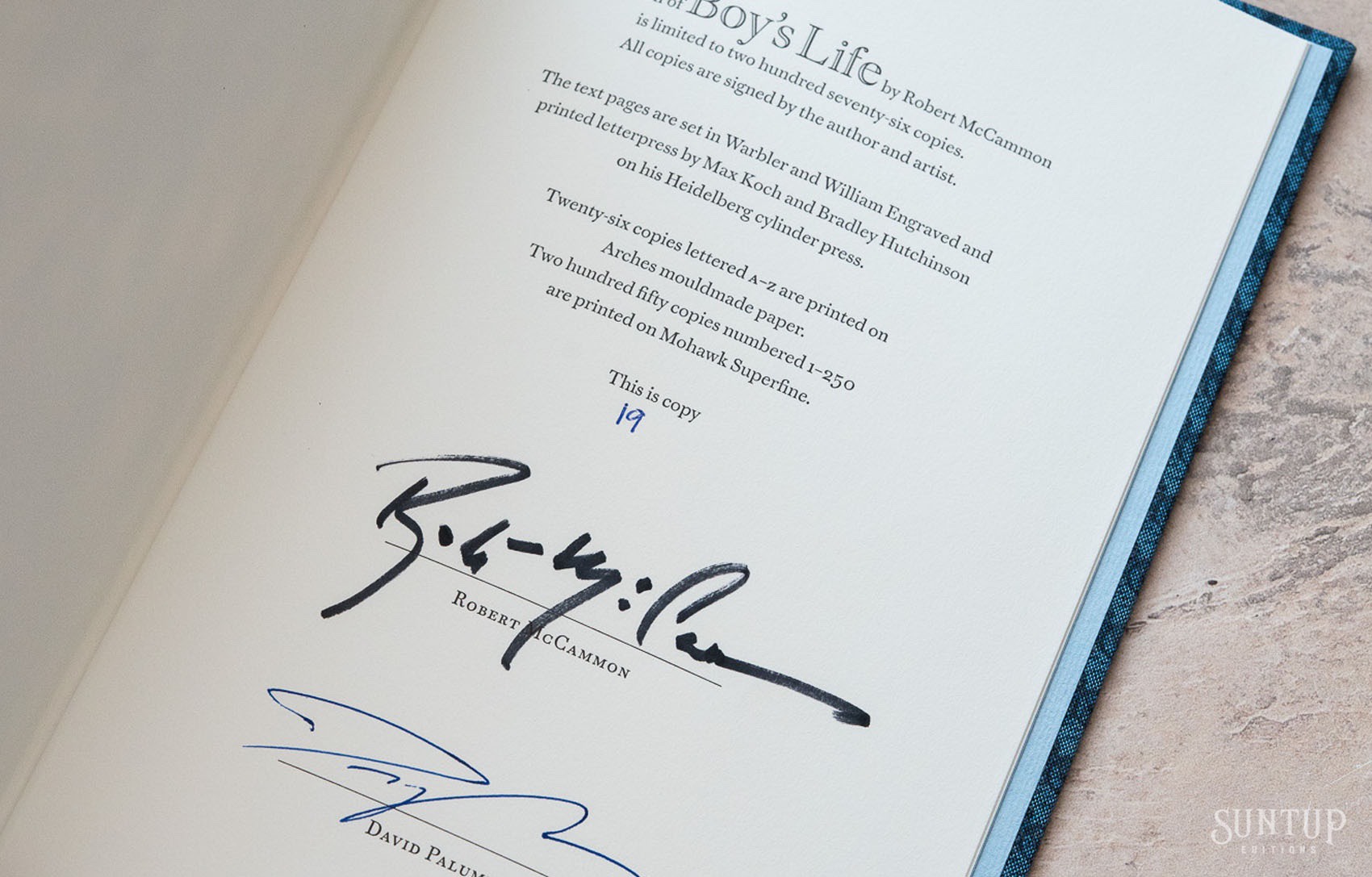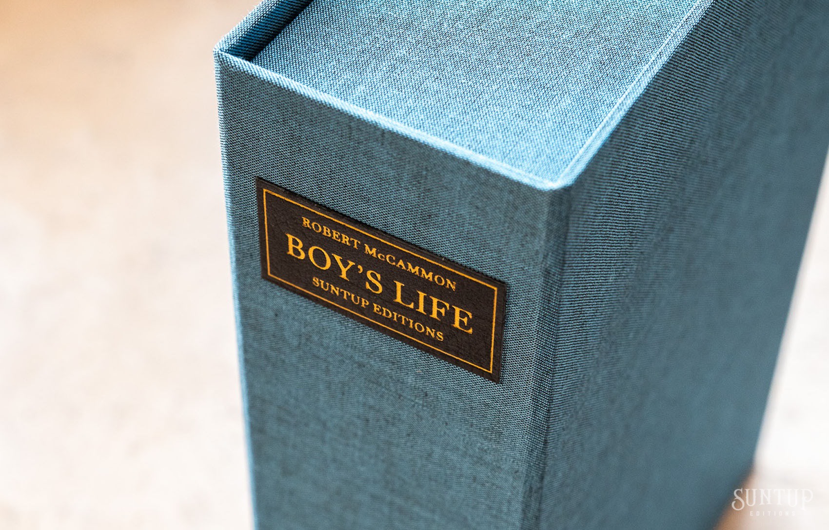 Quarter goatskin binding with a custom pattern design printed on cloth covering the boards and a foil blocked leather label. Endsheets are Hahnemühle Bugra and the head & tail bands are handmade with leather. The book is housed in a cloth covered clamshell enclosure with velour lined floors and a foil blocked leather spine label. The text pages are set in Warbler and William Engraved and are printed letterpress on Superfine.