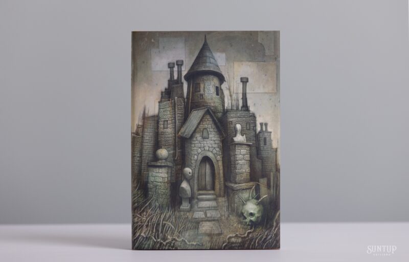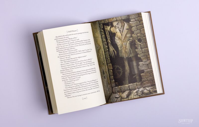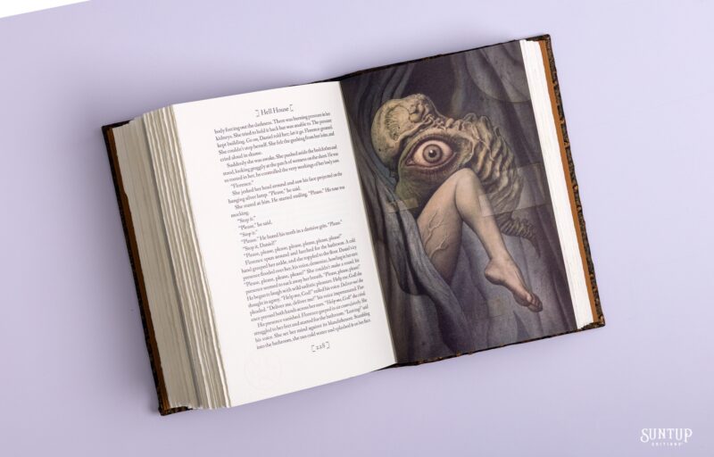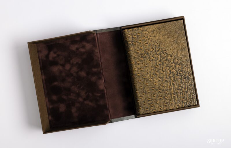 Full ostrich leather which is ethically & sustainably sourced from the world’s leading producer. The endsheets are Canson Mi-Teintes, and headbands are handmade with goatskin. The enclosure is a round spine solander box in quarter goatskin with European bookcloth and velour lined floors. The text pages are set in Fanwood and Margo and are printed letterpress letterpress on mouldmade Hahnemühle Biblio.