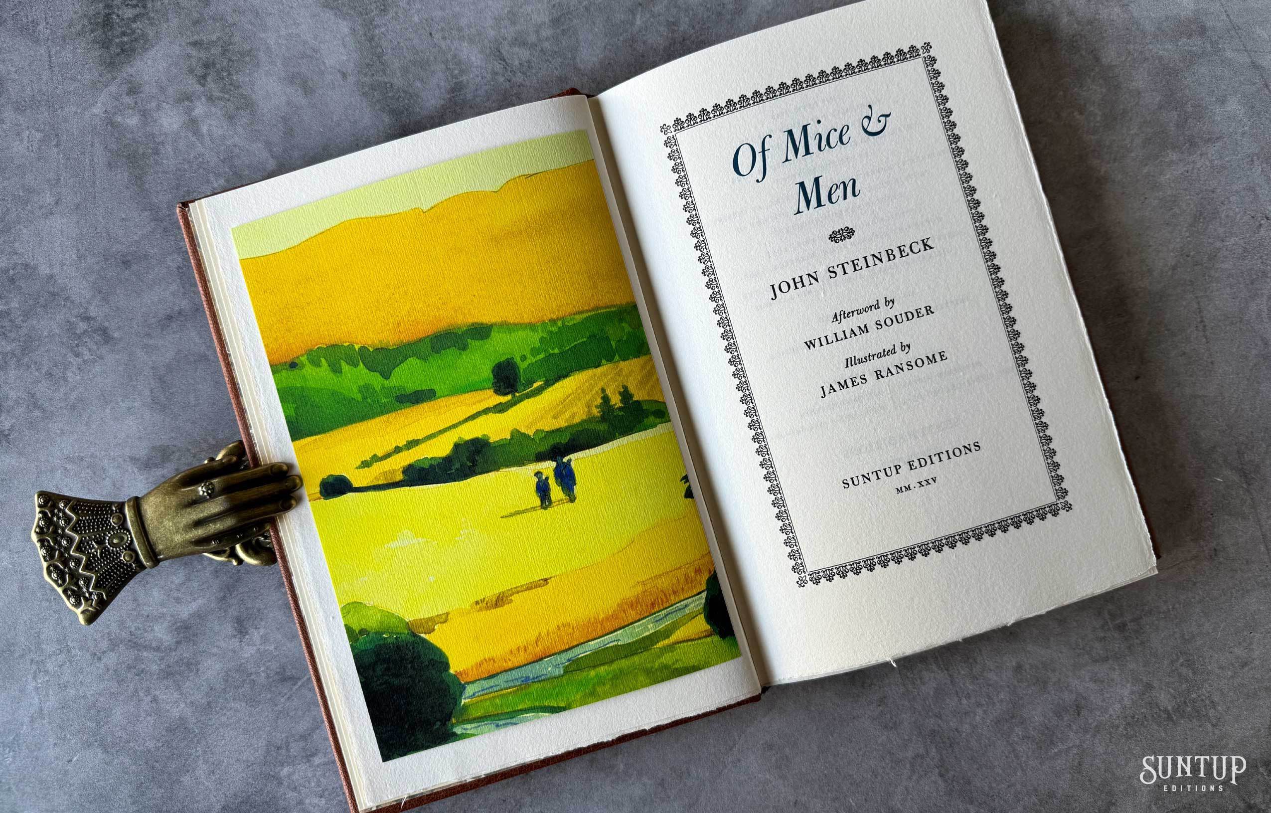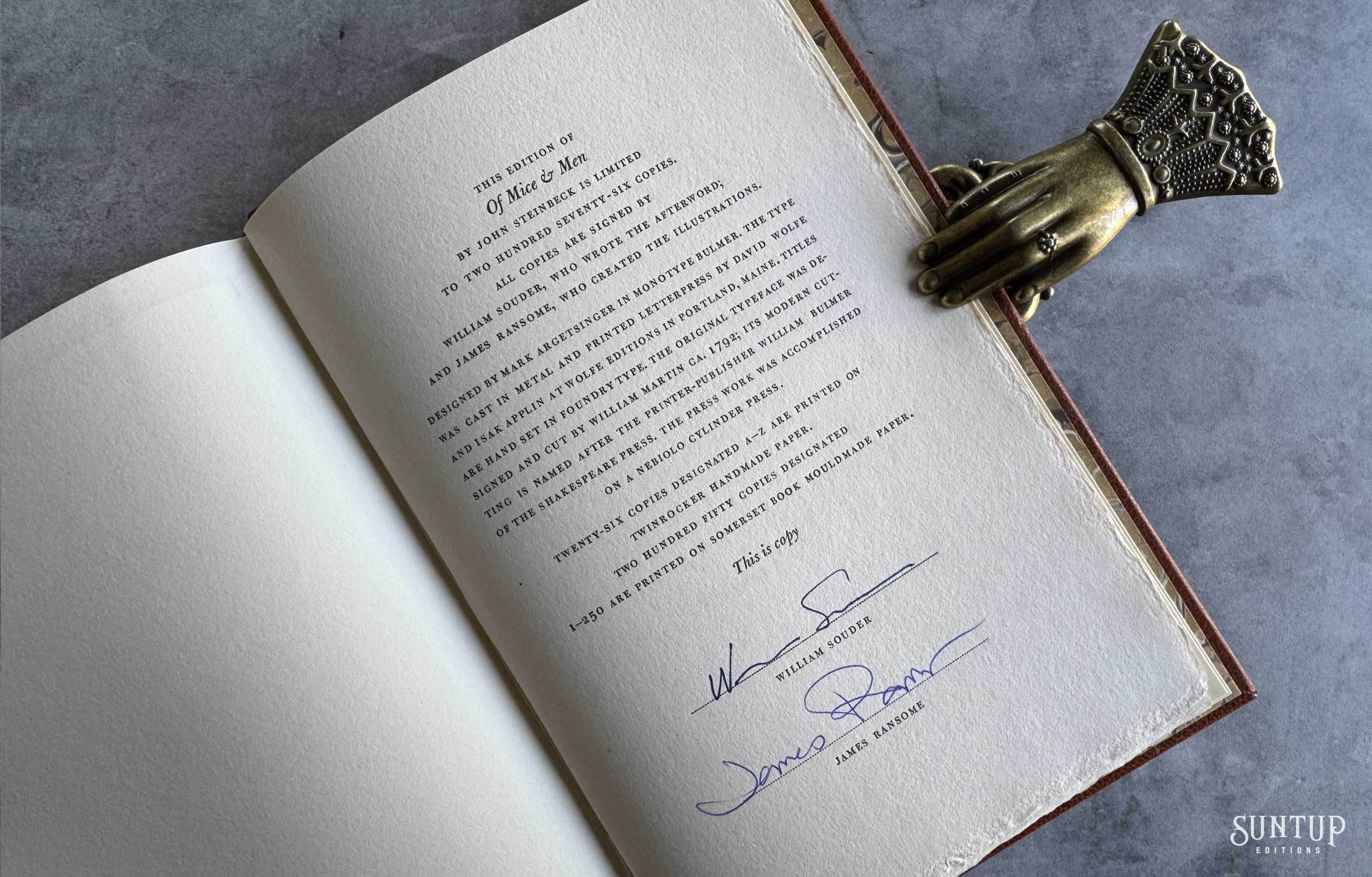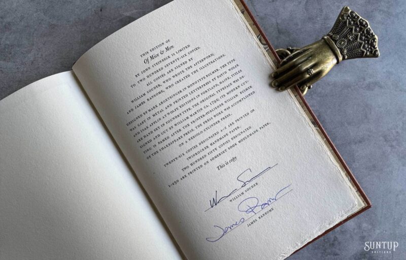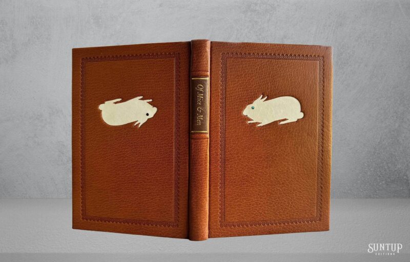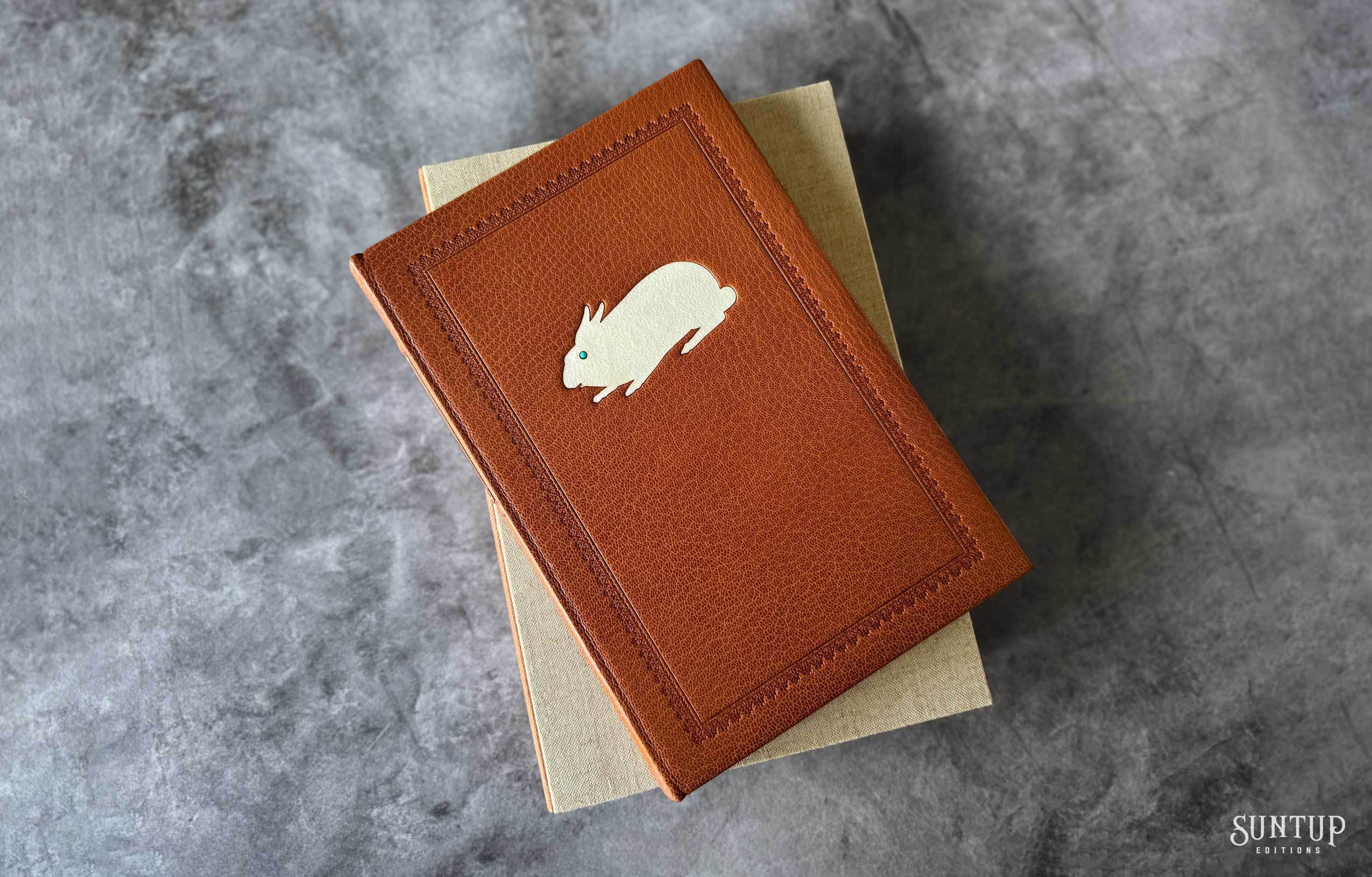 Designed by Mark Argetsinger in Monotype Bulmer; the type was cast in metal and printed letterpress by David Wolfe, Isak Applin and Claire Christensen at Wolfe Editions in Portland, Maine. Titles are hand set in foundry type. Bound in goatskin with a die-cut vellum onlay depicting a rabbit on the front and back cover. The eye on the front cover is a turquoise round cabochon gemstone, and the eye on the back cover is a black onyx cabochon gemstone. The spine features a leather foil stamped label between two raised bands. Illustrations are printed giclée. The edition is housed in a Japanese cloth covered clamshell enclosure with a leather spine and label.