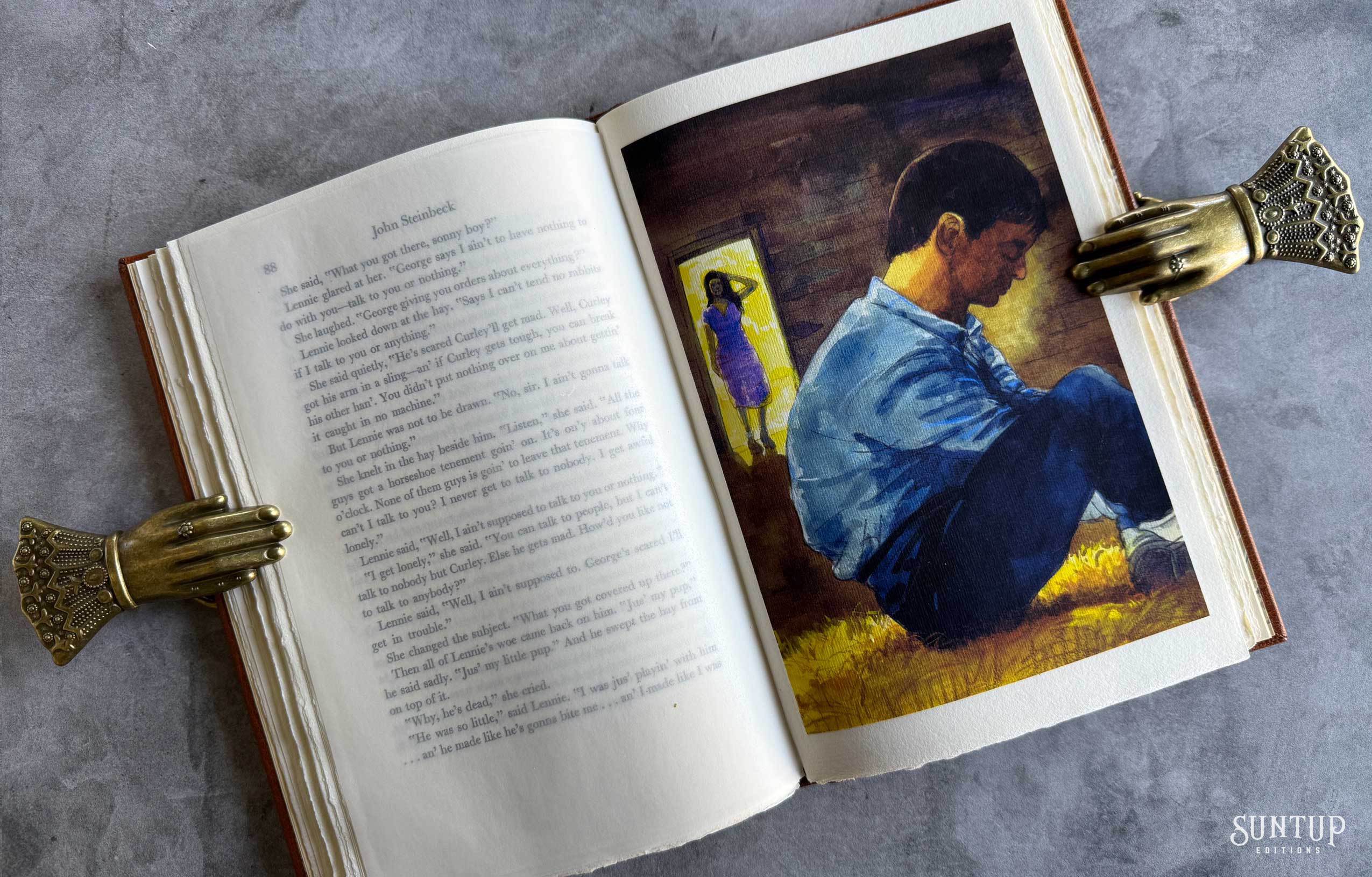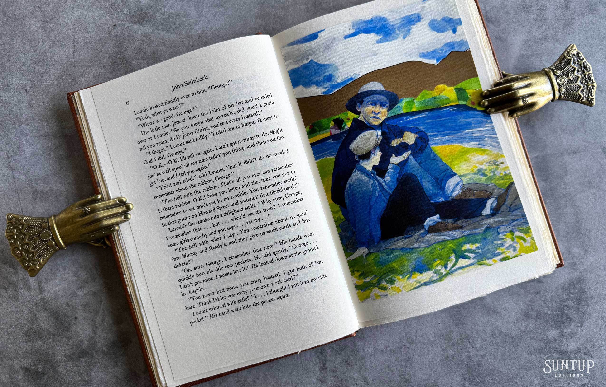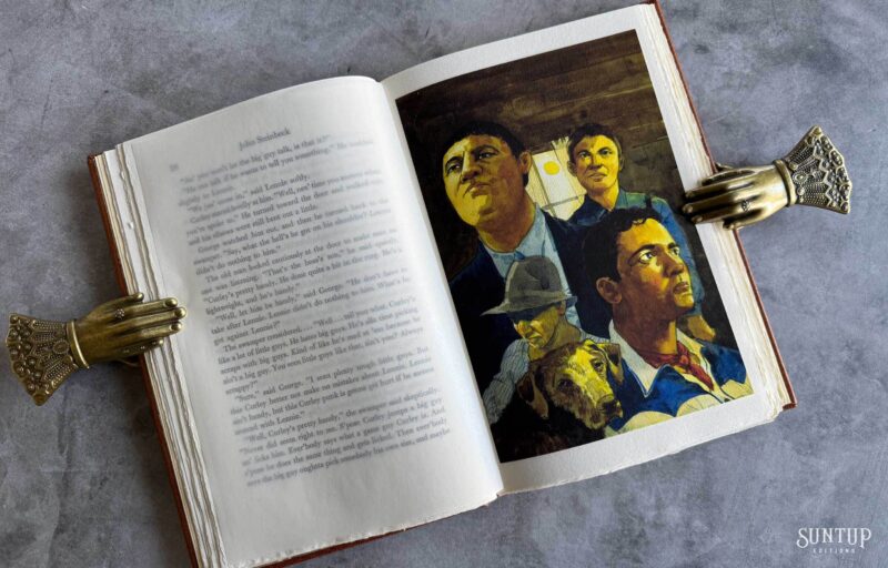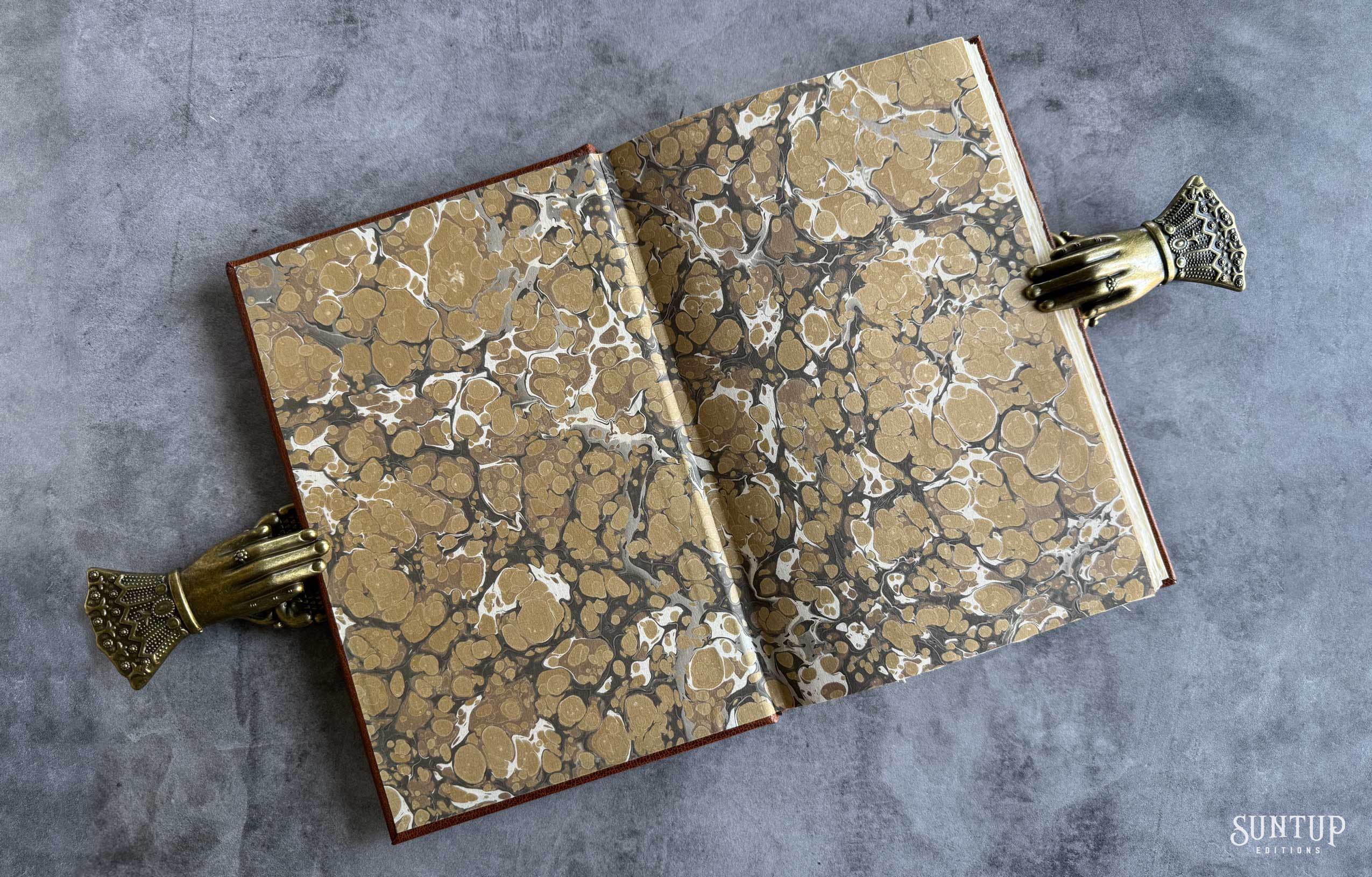 Designed by Mark Argetsinger in Monotype Bulmer; the type was cast in metal and printed letterpress by David Wolfe, Isak Applin and Claire Christensen at Wolfe Editions in Portland, Maine. Titles are hand set in foundry type. Bound in goatskin with a die-cut vellum onlay depicting a rabbit on the front and back cover. The eye on the front cover is a turquoise round cabochon gemstone, and the eye on the back cover is a black onyx cabochon gemstone. The spine features a leather foil stamped label between two raised bands. Illustrations are printed giclée. The edition is housed in a Japanese cloth covered clamshell enclosure with a leather spine and label.