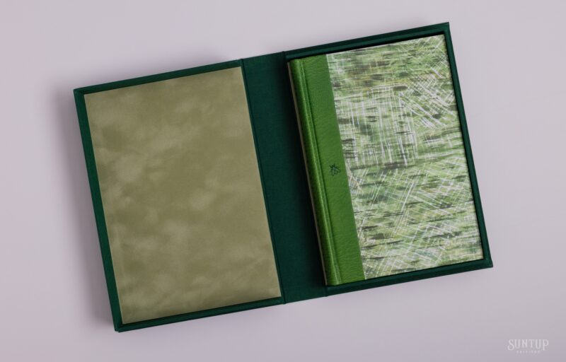 Full leather Bradel binding with leather onlays and a foil blocked cover. The top edge is colored using pigment foil. The endbands are leather wrapped, and endsheets are handmade paste paper by Magdalena Bulanda. The edition is housed in a clamshell enclosure which is covered in European cloth and debossed. The text pages are set in Roslindale types, and are printed offset on Mohawk Superfine. The edition is handbound by Jacek Tylkowski in Komorniki, Poland.